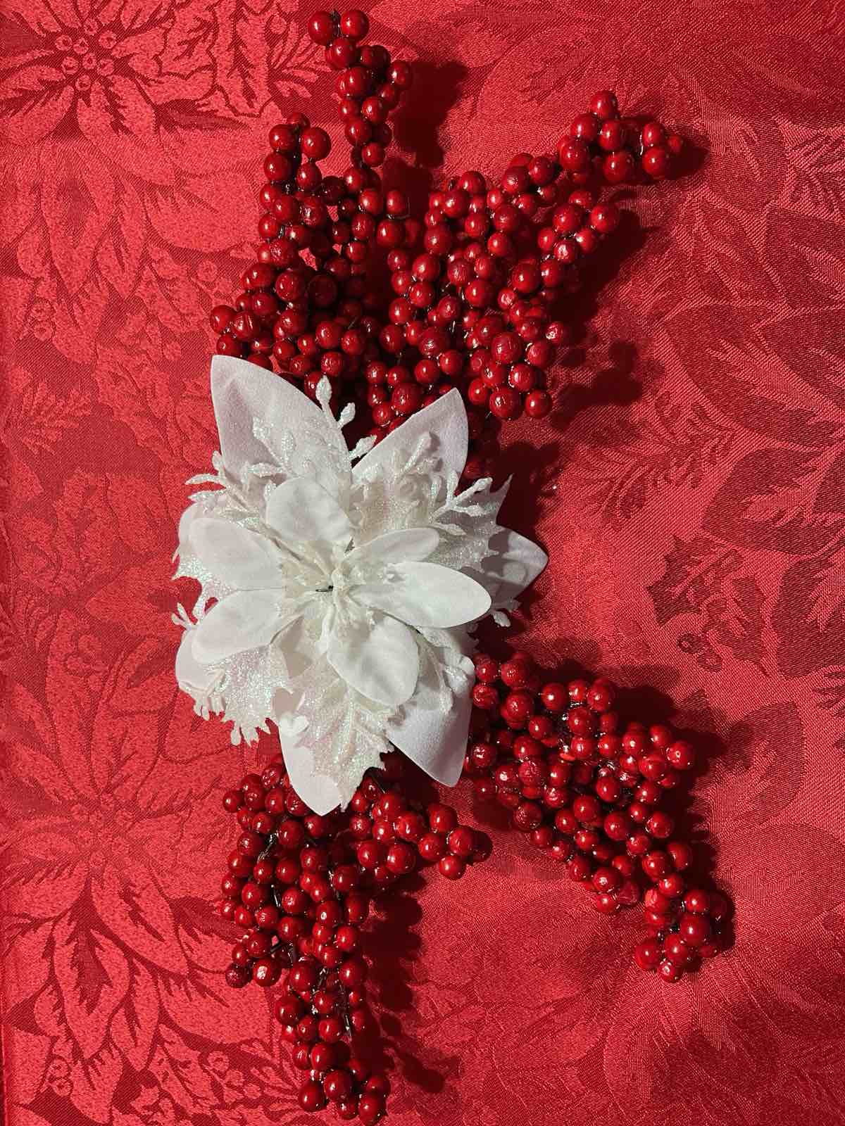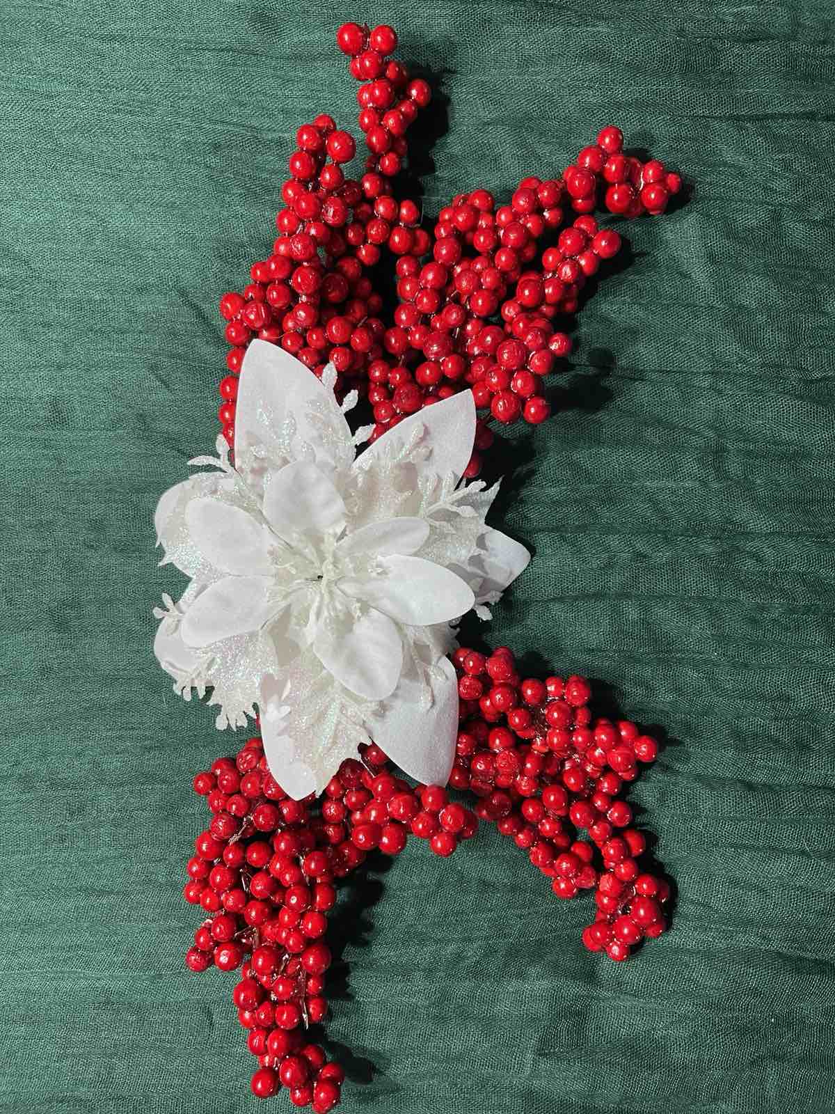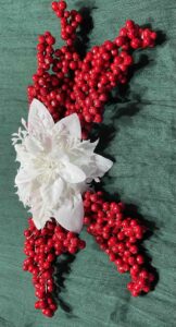 Holly and white pine leaves table decoration suitable for hanging on a wall or door. Long lasting as it is wired together.